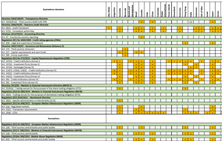 From Chile to Hong Kong, from Malaysia to Serbia, from Dubai to Brazil, from Singapore to Monaco and from Switzerland to South Africa, the third country regimes have aroused enormous interest throughout the world and among financial players. The requests for an equivalence status rained down on the Commission in the “re-regulation” years. Many operators risked having their global operations disrupted by regulatory "barriers", so the applicants. The Commission heard very well and responded generously. By its own count, it had granted more than 200 decisions, permanent or temporary, by February 2021 to some 40 jurisdictions around the world, in all kinds of financial services (audit, insurance, trading venues, prospectus, credit ratings, capital requirements for banks, etc.).