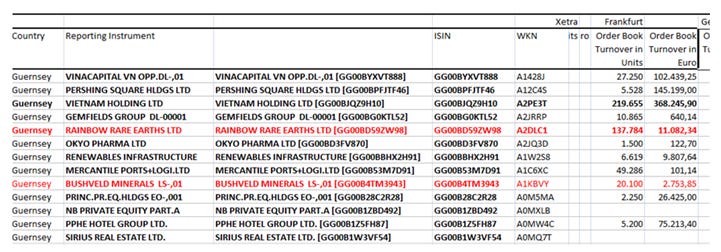 (Screen shot of a sorted listing of Deutsche Börse, Frankfurt. The letters at the beginning of the ISIN code - a code attributed to each and every listed security - indicates the country of incorporation of the issuer. GG refers to Guernsey. NB : companies in the list are also listed on the London SE. December 2020)